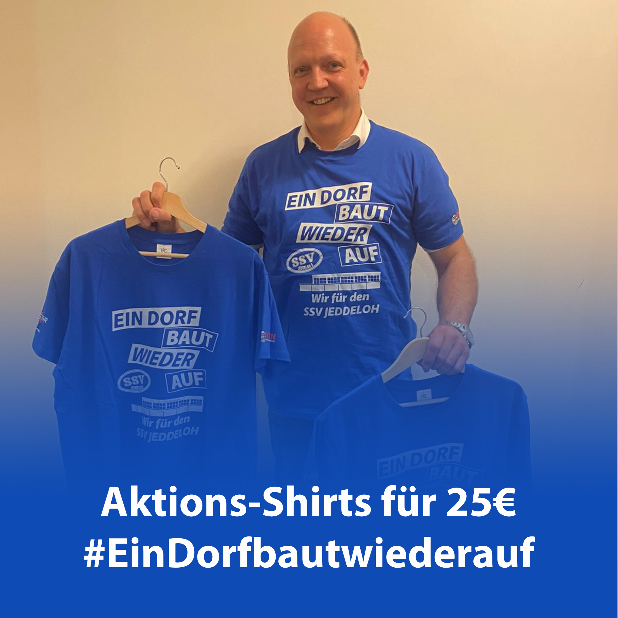 Unsere Shirts im SSV-Blau mit dem Slogan "Ein Dorf bau wieder auf" sind pünktlich zum Heimspiel in Altenoythe fertig geworden. Die alte Halle und unser Logo zieren das Shirt und machen es unvergänglich!
