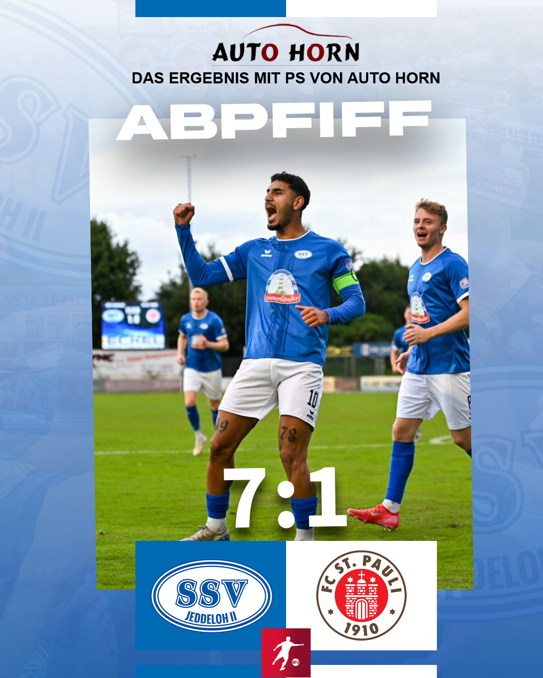 Nach 67 Spielminuten gelang den Gästen der Ehrentreffer. Nach einem Chipball beförderte Sabah das Leder ins Tor und die Hamburger hatten nochmal Pech, als sie die Latte trafen (84.). Danach war Schluss und die Fans feierten unsere Mannschaft. Wir bedanken uns herzlich für die tolle Unterstützung von den Rängen - das hat richtig Spaß gemacht. Nun geht es am Mittwoch in Lübeck weiter und schon am Samstag empfangen wir den Bremer SV wieder in der HASKAMP-Arena.